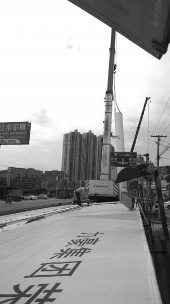 23日上午,在國道324線與南官公路交接處的紅綠燈附近,一臺大型吊機正吊著一個20多米高的T字形廣告牌,在廣告牌和大型立柱接縫處,隨著一陣火星閃現(xiàn),近百平方米的廣告牌被應(yīng)聲切下。