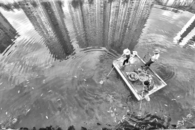 環(huán)衛(wèi)工正在內(nèi)溝河打撈死魚(yú)。