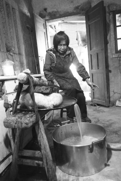 手工壓出麥芽與糯米發(fā)酵后的汁水。