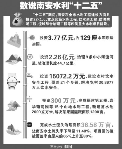 回眸“十二五”,南安水利建設(shè)成績斐然:水利建設(shè)總投資22億元;為全市129座水庫除險(xiǎn)加固;治理9條中小河流河道;鋪設(shè)34.5公里引水管線,解決沿海三鎮(zhèn)吃水難問題;飲水安全工程覆蓋24個(gè)鄉(xiāng)鎮(zhèn),惠及30余萬人……南安用5年時(shí)間描繪一幅“水利清明上河圖”?! ?/p>