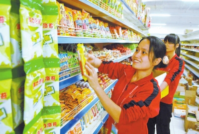 超前購物廣場(chǎng)的員工正在擺貨品。