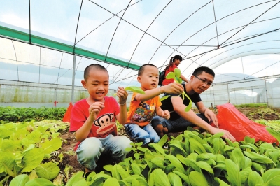 向陽鄉(xiāng)慢山莊,游客們正在采摘綠色果蔬。