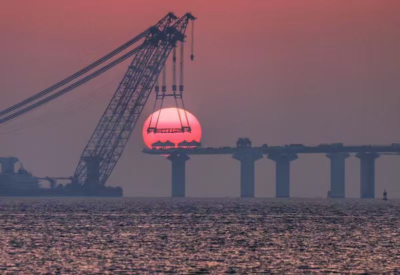 2月13日清晨,廈金大橋建設(shè)現(xiàn)場,一輪巨大的紅日躍出海面,仿佛被施工吊臂“夾”起,定格住了工程巨構(gòu)與自然霞光交相輝映的壯美瞬間。 陶卉攝