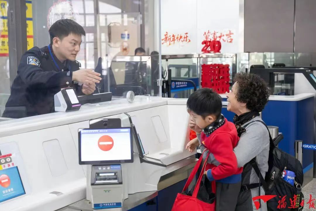 2月14日,福州黃岐客運站通關(guān)現(xiàn)場,邊檢民警耐心為老人及孩子服務(wù)。福建日報記者 王毅 攝