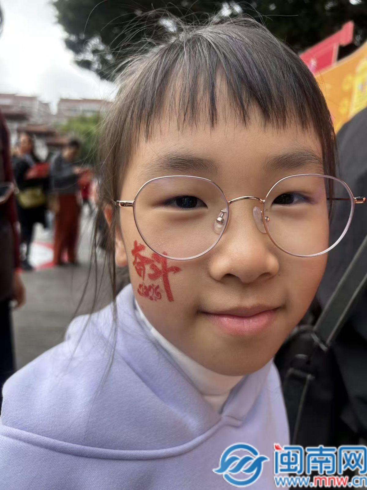 福州游客小楊,臉上貼著“奮斗2026”貼紙