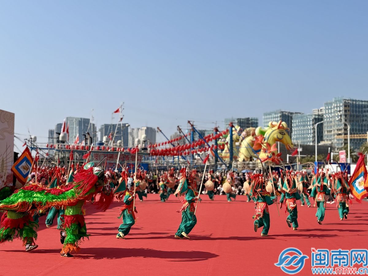 當日下午3時許,金鼓齊鳴,樂聲鏗鏘,浩浩蕩蕩的宋江陣列隊入場。百余名演員化身“簪花俠士”,在碼頭之上演繹千年兵法智慧:兩儀陣、田螺陣、八卦陣等十多種經典陣法輪番變換,陣形開合間盡顯磅礴氣勢;刣獅騰躍、南拳剛勁,一招一式再現泉州“棍棒手撲,妙絕天下”的民俗風采,讓觀眾沉浸式感受非遺魅力。