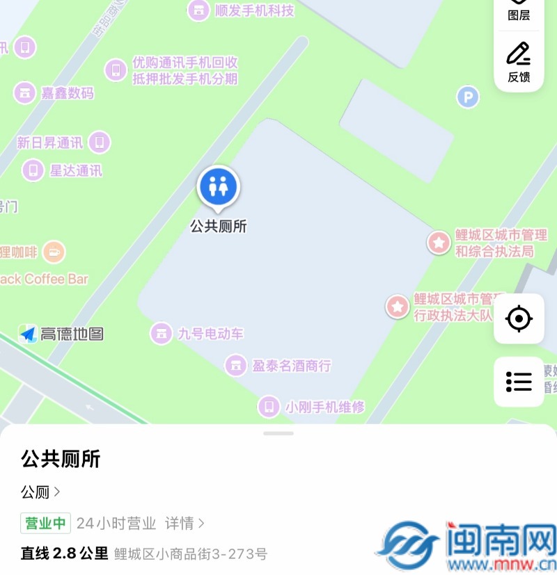 閩南網(wǎng)記者打開導航 APP 搜索發(fā)現(xiàn),困住甘女士的這座公廁位于鯉城區(qū)涂門街小商品街路段,平臺上清晰標注著“24小時營業(yè)”等信息。