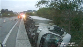 4月13日下午4時(shí)52分,泉州環(huán)城高速公路,一輛貨車翻下高速公路路面。接到報(bào)警后,泉州高速交警支隊(duì)四大隊(duì)民警立即趕到現(xiàn)場。