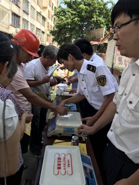 工作人員和志愿者結(jié)合食品安全周活動(dòng),現(xiàn)場(chǎng)向市民分發(fā)食品安全宣傳冊(cè)、計(jì)量與民生宣傳冊(cè),計(jì)量所人員還向市民解密鬼秤伎倆,并分發(fā)標(biāo)準(zhǔn)計(jì)量砝碼,提醒市民注意防騙。