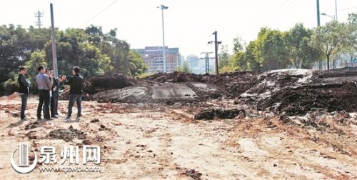 在現(xiàn)場,記者遇到了正在調(diào)查的泉州、南安、石獅兩級環(huán)保部門及南安執(zhí)法局等執(zhí)法人員。在南安大道碧桂園附近路面,散落著一些黑色污泥。從旁邊一條布滿輪胎印的土路拐進(jìn)去,眼前出現(xiàn)一大片空地,空地靠南安大道一側(cè)堆放著一大片黑色污泥。空地沿道路一側(cè)用黑布圍擋著,從南安大道上不易發(fā)覺這堆污泥。