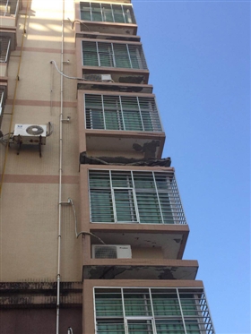 昨日,記者來(lái)到位于東港路的名仕豪園小區(qū),在蔡先生的指引下看到了掉落大石塊的地方。這是該小區(qū)一戶業(yè)主家的三樓空調(diào)露臺(tái),長(zhǎng)約2米、寬近1米的空調(diào)露臺(tái)經(jīng)過(guò)多次脫落后鋼筋裸露,仍有不少水泥塊依附在上面搖搖欲墜。在這個(gè)脫落處下方,正是小區(qū)業(yè)主摩托車的集中停放點(diǎn),摩托車停放點(diǎn)四周的鋼管圍欄有幾處已被落下的石塊砸彎。