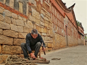 紀先生告訴記者,他小時候住在錦江村,經(jīng)??吹搅执鬆斈弥幼诖謇锏男〉郎暇幚K打繩,他那認真的模樣,至今還清楚地記得,最近再次看到他坐在那里編繩,仿佛感覺自己又回到了小時候。(記者 劉巧麗/文 通訊員 紀錦明/圖)