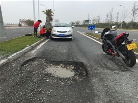 18日上午,記者來到水頭外線看到,市民反映的地點位于水頭外線通往晉江方向的一條輔道。該輔道路面坑洼不平,短短的20米路竟存在4個面積不等的大面積坑陷,其中一處最大坑陷面積達2平方米左右,深度約40厘米。記者到現(xiàn)場時,恰有兩輛小型轎車在此發(fā)生事故。據(jù)出事車主介紹,自己是因為前方車輛突然急停避讓不及導致撞向路邊路沿石。“前面的車估計也是開近了看見有個大坑才突然急剎車的。”該車主分析說。