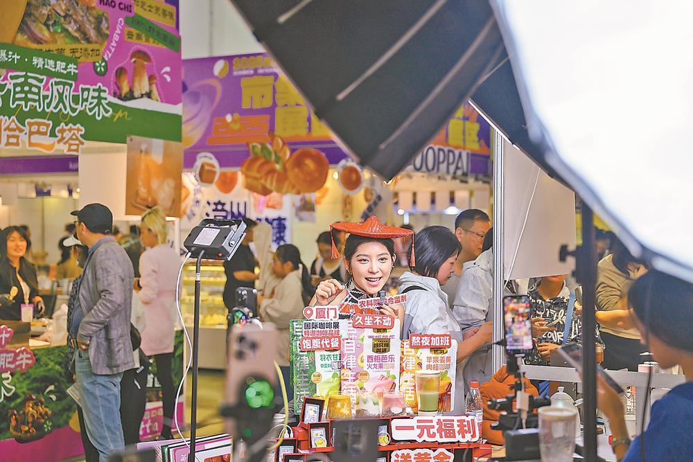 2025廈門國際咖啡產(chǎn)業(yè)博覽會現(xiàn)場,云南展商在直播推銷咖啡產(chǎn)品。福建日報記者 施辰靜 攝