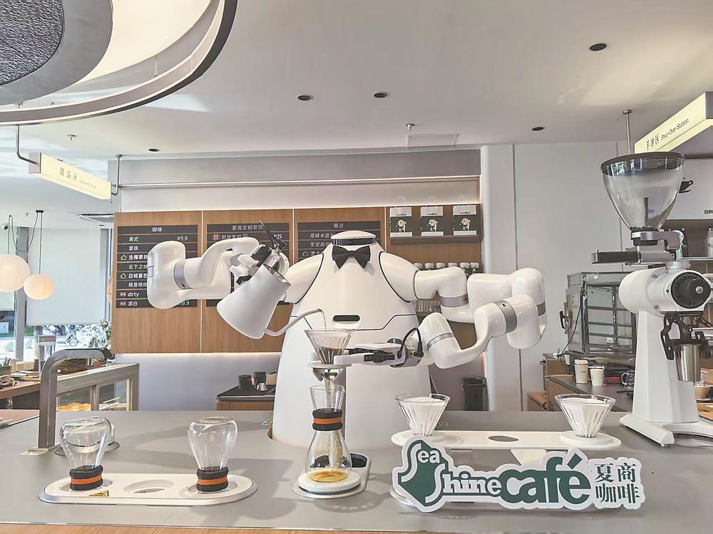 廈門人工智能創(chuàng)新生態(tài)社區(qū)夏商咖啡店內(nèi)的機(jī)器人咖啡師“大白”。福建日報記者 廖麗萍 攝