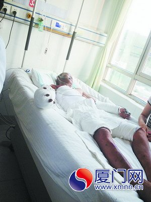昨日下午3時(shí)半,位于翔安大道邊一處工地內(nèi),52歲的老陳臀部以上部位被燒成焦黑——由于連接氧氣瓶的軟管脫落,氧氣被引燃,導(dǎo)致他被燒傷,但因?yàn)閾?dān)心氧氣和乙炔泄漏引爆氧氣瓶,他不顧燒傷帶來的疼痛,又沖上前將氧氣瓶閥門關(guān)上。整個(gè)過程不過幾秒鐘,待周圍的工友反應(yīng)過來,老陳的皮膚已像薄紙一樣脫落,頭發(fā)也燒沒了,皮膚呈焦黑狀。急救人員初步診斷,其臀部以上、頸肩部以下基本是淺二度和深二度燒傷。