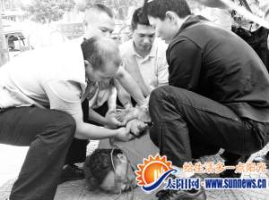 林威與同事互相點頭示意,一個拽住男子的脖子,用腳頂其后腰;一個抓住男子手持木棍的手,大喝一聲,瞬間控制男子。另外兩名便衣民警也緊跟而上,一個人抓住武瘋子的一只腳,4個人大喊一聲將男子撂倒,其他民警也趕緊拿出繩子,將男子控制起來。