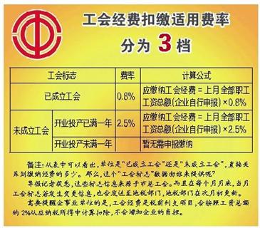 據(jù)了解,工會(huì)經(jīng)費(fèi)采用“自行申報(bào)”,而非“強(qiáng)制扣繳”。企事業(yè)單位每個(gè)月的15日前如實(shí)按期申報(bào)繳費(fèi)基數(shù)——即上月全部職工工資總額以及對(duì)應(yīng)的職工人數(shù)。地稅部門根據(jù)這些信息,按照適用費(fèi)率產(chǎn)生應(yīng)繳金額進(jìn)行扣繳,費(fèi)率共分為三檔。