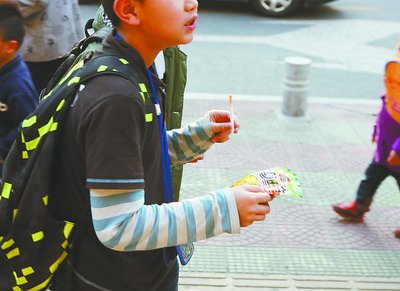 隨后,記者在路上隨機(jī)找了10多個(gè)孩子,問他們有沒有買過像香煙一樣的糖果,兩名孩子回答買過,其中一名育青學(xué)校二年級的男孩告訴記者:“我上周剛買過!”記者問他在哪里買,他還自告奮勇要帶路。在路上,男孩告訴記者,他每天自己上學(xué)放學(xué),買零食的錢是爸爸媽媽給的,“吃那種糖就跟抽煙一樣”,男孩興沖沖地說。