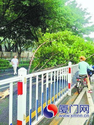 事發(fā)后,小轎車(chē)停在往東渡方向的車(chē)道上,被倒下的樹(shù)干壓住,還好車(chē)內(nèi)的人都沒(méi)事。目擊者說(shuō),當(dāng)時(shí)一輛集裝箱車(chē)開(kāi)過(guò)來(lái),因?yàn)檐?chē)身太高,把行道樹(shù)的樹(shù)干撞斷,結(jié)果跟在后面的小轎車(chē)就倒霉了。記者在現(xiàn)場(chǎng)看到,被撞下來(lái)的枝干直徑大約有20多厘米。