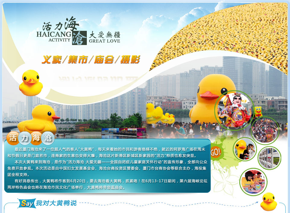 兩個月前萌萌的大黃鴨“游”進海滄湖,大黃鴨吸引省內(nèi)成千上萬的市民和游客前來觀看。它不僅帶來了歡樂,還走進自閉癥兒童的心中,喚起社會的滾滾愛心
